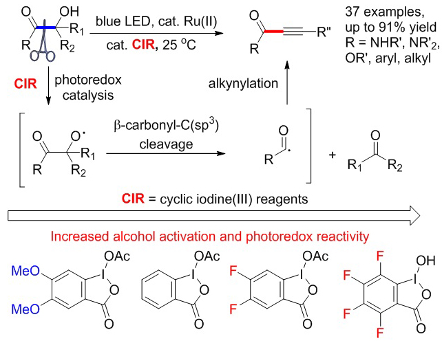 中国科学院上海有机化学研究所生命有机化学国家重点实验室的陈以昀课题组近期发现,环状高价碘试剂可以在可见光温和条件下有效活化环醇及惰性线性醇产生烷氧自由基,进而发生C(sp3)-C(sp3)键的选择性断裂官能化反应(J. Am. Chem. Soc. 2016, 138, 1514-1517)。在此工作基础上,环状高价碘试剂衍生物最近被首次应用于光催化反应,他们发现不同环状高价碘试剂对α-羟基羰基化合物的活化能力不同,可以实现α-羰基烷氧自由基的生成及CO-C(sp3)键断裂炔基化反应(Angew. Chem., Int. Ed. 2017, 56, 2478–2481)。该方法具有优秀的区域选择性和化学选择性,底物范围包括α-羟基酰胺、α-羟基酯和α-羟基酮,具有良好的化学生物学应用前景。