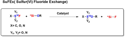 高价主族氟化物具有很高的化学稳定性,但其在特定条件下的活化又能实现极其高效的化学键转化和链接,这种特殊的稳定性与反应性的结合,决定了该类化合物在有机合成化学、材料化学、化学生物学和药物化学中将有着独特的潜在应用。六价硫氟交换反应Sulfur(VI)Fluoride Exchange(SuFEx)的成功正是利用了六价硫氟键的这种特殊反应活性。自从2014年,Sharpless教授(Angew. Chem. Int. Ed. 2014, 9430) 首次提出并成功实现六价硫氟交换反应以来, 该类反应已在有机合成化学、材料化学、药物化学、化学生物学特别是蛋白质分子选择性标记和修饰等方面受到广泛关注并展示了很好的应用前景,被称为新一代点击化学,成为当前氟化学研究的新热点(图一)。