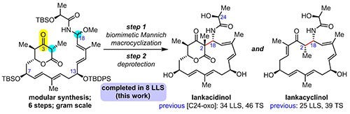 中国科学院上海有机化学研究所天然产物有机合成化学院重点实验室的洪然课题组近期完成了兰卡杀菌素家族lankacidinol和lankacyclinol的仿生全合成(J. Am. Chem. Soc. 2017, 139, 12939-12942. doi: 10.1021/jacs.7b08500)。研究团队受到生物合成路径中独特的大环构建策略的启发,针对现有化学合成策略中C3羰基的氧化态调整及保护基操作过于繁琐的问题,采取了预置C3和C18位氧化态以及氮原子取代基的Mannich大环环化策略,设计使用四个从商品化原料出发可快速大量获得的手性模块,通过可靠的六步反应,克级规模地制备了长链亚胺前体。在前期分子间模型反应探索的最优条件下,该化合物在非极性溶剂中建立热解平衡,产生的N-酰基共轭亚胺中间体被长链碳端的b-酮基-d-戊内酯结构单元捕获,立体选择性地形成目标分子核心结构的C2-C18键。最后通过细心地优化脱除硅基保护基条件,可以选择性地合成两个天然产物,并在此过程中首次发现了lankacidinol在酸性条件下C7-OH的立体选择性1,5-转位平衡现象。该仿生合成工作的完成为进一步探索lankacidin家族天然产物的生物合成机制和构效关系提供了有力支持。