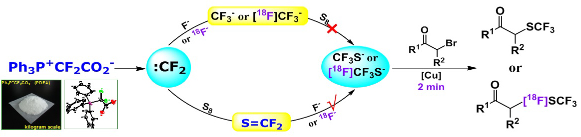 一般认为,三氟甲硫基负离子(CF3S-)可由三氟甲基负离子(CF3-)与硫反应得到,而三氟甲基负离子(CF3-)也能从二氟卡宾(:CF2)与氟离子(F-)反应生成。该课题组发现,由Ph3P+CF2CO2-产生的二氟卡宾确实能与氟离子和硫反应,实现卤代烷的三氟甲硫基化。而且由于该反应无需任何过渡金属、反应速度很快(5分钟),他们与哈佛医学院的梁欢课题组合作,将该策略成功应用于18F标记的三氟甲硫基化(Angew. Chem. Int. Ed. 2015, 54, 13236-13240)。然而,进一步的机理研究表明,从二氟卡宾到三氟甲硫基负离子的转化并非经历上述普遍认为的过程,而是二氟卡宾先与硫反应生成硫代氟光气(S=CF2),然后再结合氟离子形成三氟甲硫基负离子,这样产生的三氟甲硫基负离子可以很好地实现α-溴代羰基化合物的三氟甲硫基化,也同样发展成了一种高效的18F标记方法(Angew. Chem. Int. Ed. 2017, 56, 3196-3200)。由于18F标记的诊断试剂是PET(正电子发射断层扫描)技术的核心与基础,Ph3P+CF2CO2-——这一新的二氟卡宾试剂及其反应在PET医学影像诊断试剂的研究与开发中,有潜在的应用前景。