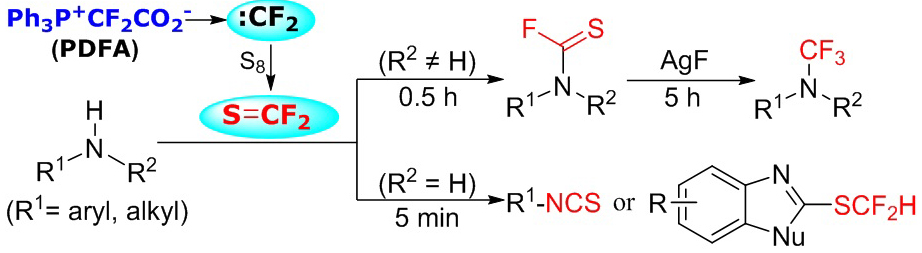 上述反应展现了二氟卡宾可以成为一种制备硫代氟光气(S=CF2)的实用方法。尽管硫代氟光气具有独特的反应性能,但由于其制备困难、沸点低、毒性高等缺点,一直未能实现广泛应用。在上述研究基础上,进一步研究了硫代氟光气的反应。发现硫代氟光气可以与不同结构的胺发生反应,分别得到硫代氟甲酰胺(可进一步转化为三氟甲基胺)、异硫氰和二氟甲硫基取代的芳香杂环。反应温和高效,硫代氟光气不需分离、在反应体系中迅速转化,有效避免了硫代氟光气制备、存储和运输中潜在的危险和不便(Angew. Chem. Int. Ed. 2017, 56, 16669-16673)。该反应可以高效构建含二氟甲硫基的芳杂环,相较于该类分子的已有合成方法具有明显优势,有望用于含氟药物的研究开发。
