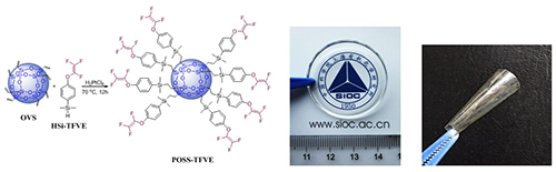 倍半硅氧烷(POSS)是具有独特笼型结构的纳米材料,常作为添加剂引入聚合物中以改善其力学和介电等性能。但POSS的氟功能化研究较少,主要原因是缺少直接氟化的有效方法。经过探索,该课题组采用高效的铂催化硅氢加成反应,一步反应即将含氟基团引入到POSS中,实现了POSS的氟烷基化和功能化。该方法使难溶和难熔的POSS既能溶解也能熔化,热聚合获得的新型有机-无机杂化材料片材和薄膜,表现出较高的透明性和高频条件的优异介电性能(5 GHz时的介电常数2.51,介电损耗3.1 × 10-3)。甚至在潮湿的环境中,这种杂化材料仍能保持稳定的介电性能,为该材料在高频通讯领域中的潜在应用创造了条件(ACS Appl. Mater. Interfaces 2017, 9, 12782)。
