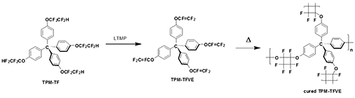 中科院上海有机所有机功能分子合成与组装化学院重点实验室房强课题组在这一领域开展系统研究,利用三氟乙烯基醚的可加热成环的特性,发展可热交联的含氟聚合物,并在近期取得一系列研究成果。通过设计多官能度(>3)大单体的策略,使得聚合物的链增长朝多个方向进行,有效地避免了三氟乙烯基醚单体难以形成高分子量聚合物的缺陷。该策略既可改善含氟聚合物的加工性,又能获得良好的绝缘性、耐热性和透明性等。在三氟乙烯基醚的合成方法上,巧妙地将碱性强而亲核性弱的2,6-二甲基哌啶锂 (LTMP)用于四氟乙基醚的消除反应,简便而高收率地制备了四取代三氟乙烯基醚的四苯甲烷(TPM-TFVE)。该分子具有四面体骨架,通过热交联可获得含有微孔结构的含氟聚合物。该聚合物显示出极好的介电性能,其介电常数在10 MHz以下低于2.29,在高频5 GHz下的介电常数和介电损耗分别为2.36和1.29×10-3,优于传统的商用低介电材料(Macromolecules 2016, 49, 7314)。