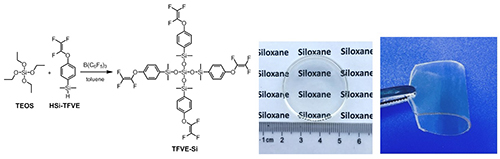 该课题组还发现,有机硅氧烷水解缩合中会产生Si-OH基团,硅氢加成反应中也会产生柔性-Si-CH2-CH2-链段,这些基团和链段的存在,对高频下聚硅氧烷的介电性能和热稳定性有不利影响。为解决这一问题,该课题组通过一步Piers-Rubinsztajn反应,对基础工业原料正硅酸乙酯(TEOS)进行了氟功能化,原位形成的含氟有机硅氧烷大单体热聚合后可形成透明薄膜,该薄膜在10 GHz的超高频下,显现介电常数2.50、介电损耗4.0 ×10-3的优异性能,而普通的未造孔的二氧化硅薄膜和聚有机硅氧烷的介电常数通常大于3.0(Macromolecules 2017, 50, 9394)。