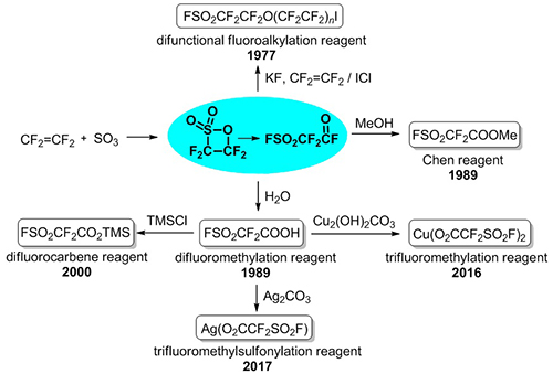 图一、代表性的由四氟乙烯-β-磺内酯衍生的氟烷基化试剂