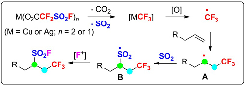 图二、烯烃氧化自由基三氟甲基化氟磺酰基化反应设计