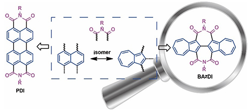 苝二酰亚胺(PDI)是一类明星的染料/颜料分子(图1),其分子结构由萘环和酰亚胺基团组成,已广泛应用于生产实践和有机半导体材料研究。高希珂课题组设计并合成了一种新型有机半导体材料结构砌块——联薁二酰亚胺(BAzDI)(图1),其分子结构由两个薁环和两个酰亚胺单元组成(Chem. Sci. 2016, 7, 6701-6705. Highlighted by Synfacts 2016, 12, 1040)。鉴于薁和萘互为同分异构体,从化学组成上看,BAzDI和PDI的分子骨架只相差两个氢原子,这使得BAzDI化合物的物理化学性质和光电功能备受期待。研究表明,BAzDI具有独特的分子结构和物理化学性质,有望成为一类重要的有机半导体材料结构砌块。