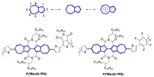图2. 薁共振结构及其2,6-位连接的共轭聚合物P(TBAzDI-TPD)和P(TBAzDITFB)