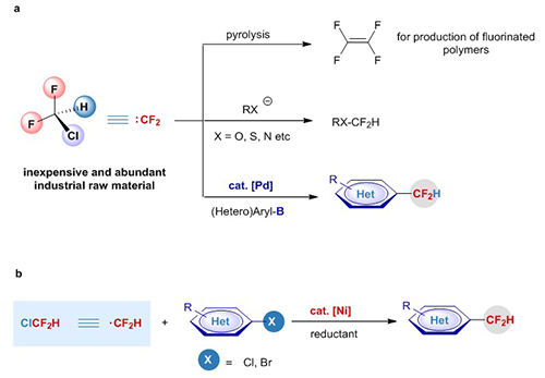 一氯二氟甲烷(ClCF2H)是一种廉价的大宗氟化工原料,目前主要用于生产含氟聚合物和制冷剂,利用ClCF2H作为含氟试剂对有机分子进行直接二氟甲基化反应是最为廉价高效的方法。然而,ClCF2H的活化与转化却具有很大的挑战性,最主要的原因是其分子中C-Cl键较强,相对惰性。到目前为止,大多数关于ClCF2H的转化方法都涉及到二氟卡宾途径,且反应条件苛刻,或者通过高温裂解产生二氟卡宾用于生产四氟乙烯和相关的聚合物,或者通过强碱性条件产生二氟卡宾用于杂原子的二氟甲基化反应。2017年,张新刚课题组报道了利用ClCF2H在钯催化下对芳基硼酸的直接二氟甲基化反应(Nat. Chem. 2017, 9, 918),实现了利用过渡金属催化在温和条件下对ClCF2H的高效转化(图 1a)。该反应具有非常广谱的底物适用性,经历了钯二氟卡宾催化途径,是首例ClCF2H的催化二氟甲基化反应。