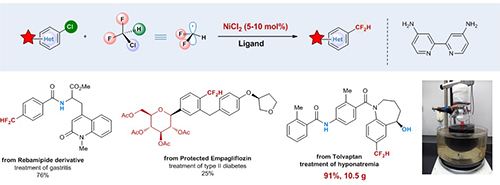最近,该课题组在上述工作的基础上,成功实现了首例镍催化下ClCF2H对芳基氯代物的二氟甲基化反应,其反应路径与钯催化的二氟卡宾途径截然不同(Nat. Commun. 2018, DOI:10.1038/s41467-018-03532-1, 图1b)。这也是首例镍催化下以氟卤烷烃为底物的还原偶联反应,是一种新的氟烷基化策略。该反应高效便捷,底物普适性广,可以兼容中性、吸电子和给电子取代的芳基氯代物,与之前报道的经典C-H化学中镍催化的还原偶联反应(只有具有吸电子基的芳基氯才能使反应有效发生)形成了鲜明对比。更为重要的是,这一体系对很多官能团都能很好兼容,包括杂环和一系列商业可得的药物。此外,该反应的实用性和可放大性也通过了10克量级的放大反应得以体现(图2)。不同电性的芳基氯代物都可以进行10克级放大,并且某些底物还表现出了比小量反应更高的效率;值得注意的是,即使药物分子进行10克级的后期氟修饰反应,其产率也能高达91%,更为重要的是,将ClCF2H的用量降低至2当量,并没有明显影响反应的效率,从而为药物化学提供了一种高效、可靠实用的方法。