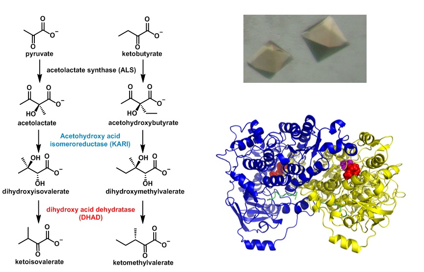 图一、植物支链氨基酸合成途径中三种广谱除草剂靶点以及其中的二羟酸脱水酶(DHAD)的晶体和晶体结构图片