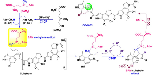 都是CC-1065环丙基生物合成所必需的,并且这两个基因的突变株都能积累同一个环丙基缺失的中间体。随后以该中间体为底物,由重构的C10P和C10Q组成的双酶体系在严格无氧的条件下能够实现该中间体的环丙基化,从而生成CC-1065。为了探讨环丙基化的催化机理,该团队还开展了关键中间体的质谱检测、CD3-SAM(腺苷化甲硫氨酸)和D2O同位素标记实验以及关键氨基酸残基的点突变研究。其中,检测到SAM-底物共价中间体使作者推测了S-腺苷甲硫氨酸亚甲基自由基这一新颖物种的存在,并提出了该双酶体系共同催化CC-1065环丙基形成的生物合成过程。这种新型环丙基化机制的揭示不仅拓展了对HemN家族蛋白和甲基转移酶所催化反应的认识,而且暗示着S-腺苷甲硫氨酸可以产生不同的自由基化学。