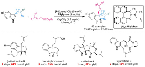 中国科学院上海有机化学研究所金属有机化学国家重点实验室的游书力研究团队首次提出并一直致力于催化不对称去芳构化(CADA)反应的发展,该策略能够简单高效地将平面芳香化合物转化成具有三维结构的复杂手性分子(Angew. Chem. Int. Ed. 2012, 51, 12662. Chem 2016, 1, 830.)。受酶催化异戊烯基化去芳构化反应的启发,他们最近实现了钯催化的吲哚衍生物不对称异戊烯基化去芳构化反应,高效地构建了一系列含有异戊烯基取代的吡咯并吲哚啉类生物碱(Nature Catalysis DOI: 10.1038/s41929-018-0111-8, https://www.nature.com/articles/s41929-018-0111-8)。该方法使用的底物简单易得,大大拓宽了不对称异戊烯基化去芳构化反应的底物范围;并且研究团队展示了该方法在相关吡咯并吲哚啉类天然产物的合成中可以大大缩短步骤。