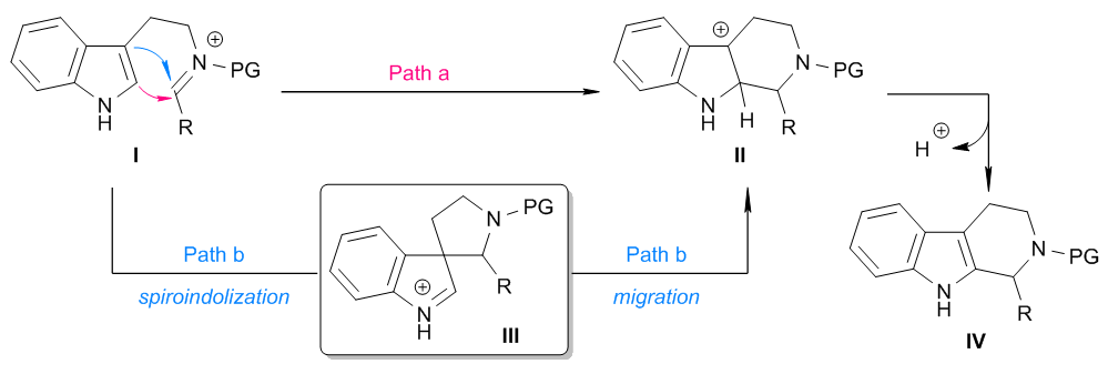 Pictet–Spengler反应是合成含有四氢-β-咔啉结构片段的吲哚类生物碱的重要方法,从最初发现至今已有100多年的历史。但是长期以来关于Pictet–Spengler反应的机理一直存在争论。理解Pictet–Spengler反应机理的一个关键问题是反应是否经历螺环假吲哚(spiroindolenine)中间体的形成和扩环迁移过程(图1,Path b)。早在1950年代Woodward合成马钱子碱的过程中就已经利用了螺环假吲哚的合成反应。此后,陆续有文献报道了在类Pictet–Spengler反应条件下可以捕获到螺环假吲哚物种。但是这些工作都不足以说明螺环假吲哚中间体的形成和转化是否与Pictet–Spengler反应产物的生成直接相关。并且以往的DFT理论计算也不支持螺环假吲哚中间体参与的反应机理(J. Am. Chem. Soc. 2008, 130, 710.)。
