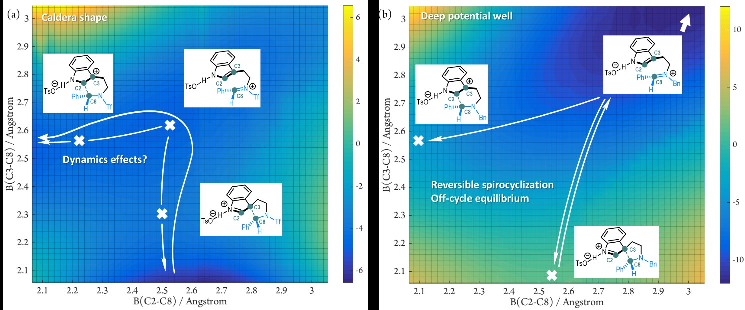 基于上述结果研究人员意识到Pictet–Spengler反应前体I中亚铵正离子部分的电子性质可能对反应历程和立体化学有重要影响。深入的DFT计算表明当I中氮原子上带有强吸电子基团时(PG = Tf),螺环假吲哚中间体III可以发生有效的扩环迁移反应。亚铵正离子和吲哚环之间较强的相互作用使得迁移反应经历了典型的火山口型势能面(Caldera shape PES),迁移反应很可能具有显著的动态学效应(Dynamics effects)。轨线分析(Trajectory analysis)证实螺环假吲哚中间体III可以通过快速的迁移反应(平均时间尺度为数百飞秒)生成质子化四氢-β-咔啉II。该迁移反应过程中亚铵正离子部分的立体化学完全保持。当I中氮原子上带有强给电子基团时(PG = Bn),螺环假吲哚中间体III的形成是一个可逆过程,与Pictet–Spengler反应最终产物的形成没有直接关系(图2)。在此基础上,研究人员提出Pictet–Spengler反应可能经历的两种极限机理(图3)。螺环假吲哚中间体可以作为“产出性中间体(Productive intermediate)”或者“非产出性中间体(non-Productive intermediate)”参与Pictet–Spengler反应。螺环假吲哚中间体的立体化学信息可能通过立体专一性的扩环迁移过程传递至最终产物中。该理论预测也已被进一步实验结果所证实。研究人员还将此机理模型推广至一系列已知的催化不对称Pictet–Spengler反应中,通过两个易算的能量参数可以方便地对某一给定的Pictet–Spengler反应的历程做出快速判断。关于Pictet–Spengler反应的统一机理认识有助于进一步挖掘螺环假吲哚中间体的反应性能,以及发展针对吲哚多环化合物的新型合成方法。