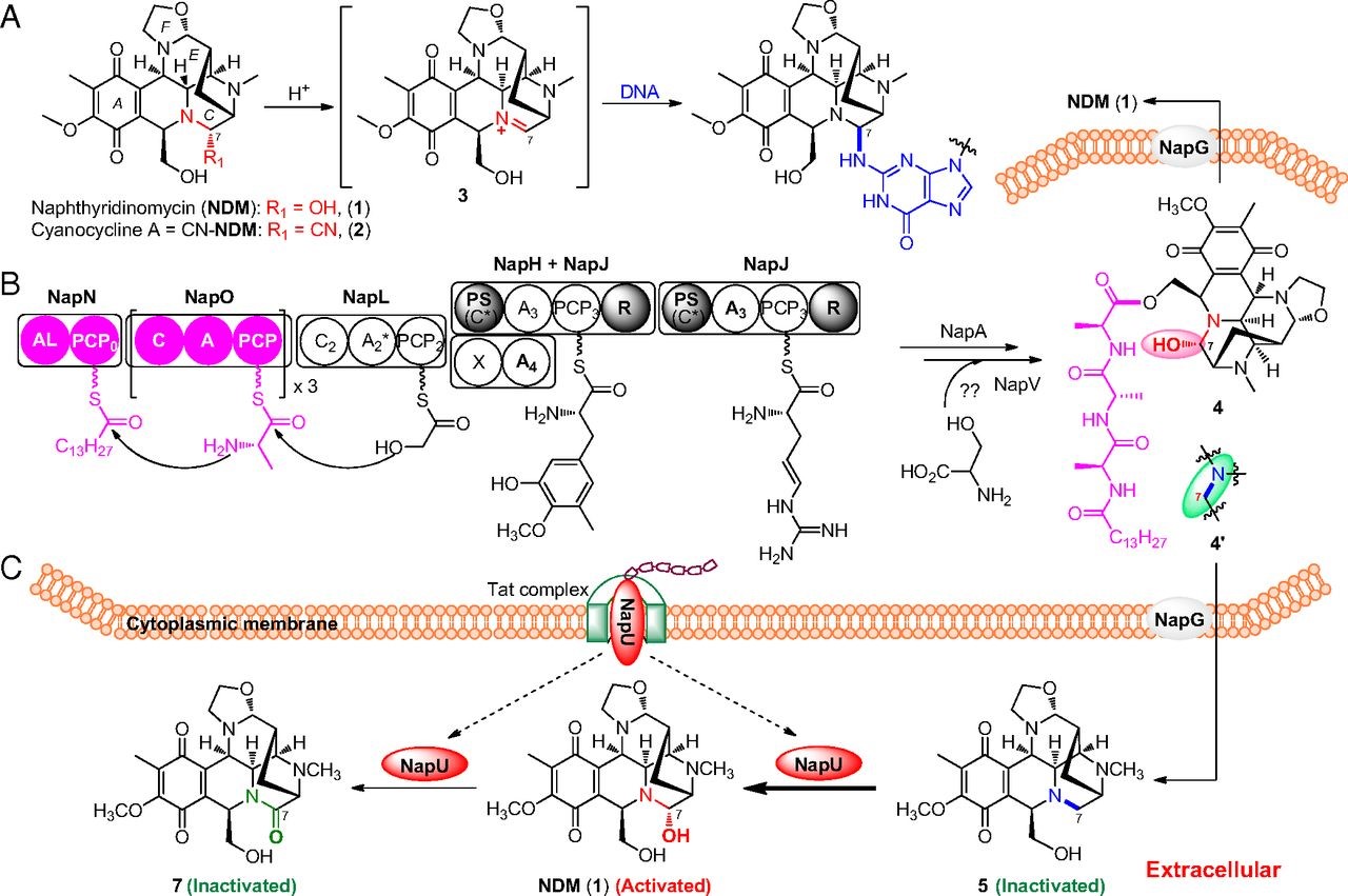 细菌通过次级代谢产生具有生物活性的抗生素从而清除异己,争夺环境中的资源,那抗生素产生菌如何避免抗生素对自身产生伤害呢?近期中国科学院上海有机化学研究所生命有机化学国家重点实验室唐功利研究员课题组在高活性天然产物萘啶霉素(NDM)的生物合成研究过程中,发现了一个分泌型、FAD依赖的氧化还原酶NapU在胞外氧化无活性前体生成具有生物活性的萘啶霉素,随后还可以进一步氧化萘啶霉素使其失活。相关成果近期发表在《美国科学院院报》上(Proc Natl Acad Sci USA 2018,115:11232-11237)。