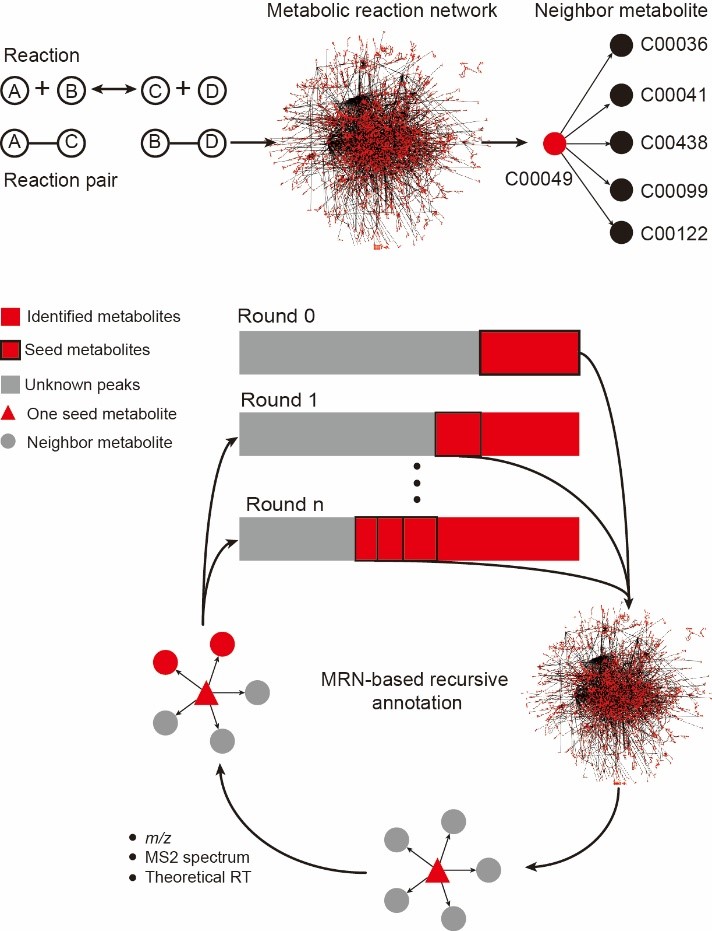 近日,国际知名学术期刊《Nature Communications》杂志发表了由中国科学院上海有机化学研究所生物与化学交叉研究中心朱正江研究员课题组的最新研究成果“Metabolic Reaction Network-based Recursive Metabolite Annotation for Untargeted Metabolomics”基于液相色谱-质谱联用(LC-MS)技术的非靶向代谢组学研究严重受限于代谢物结构鉴定的低效率和低准确度。该工作首次发展了一种基于代谢反应网络的代谢物结构鉴定算法MetDNA,创新性地克服了代谢物结构鉴定对于代谢物标准MS/MS谱图库的依赖,能够在多种生物样本中鉴定出超过2,000种代谢物的结构,相比传统方法提高了近10倍,极大地提高了代谢物结构鉴定的效率和准确度。