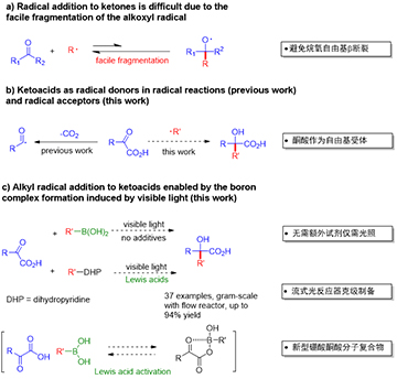 图一. 可见光促进的硼试剂活化的烷基自由基对酮酸的加成反应