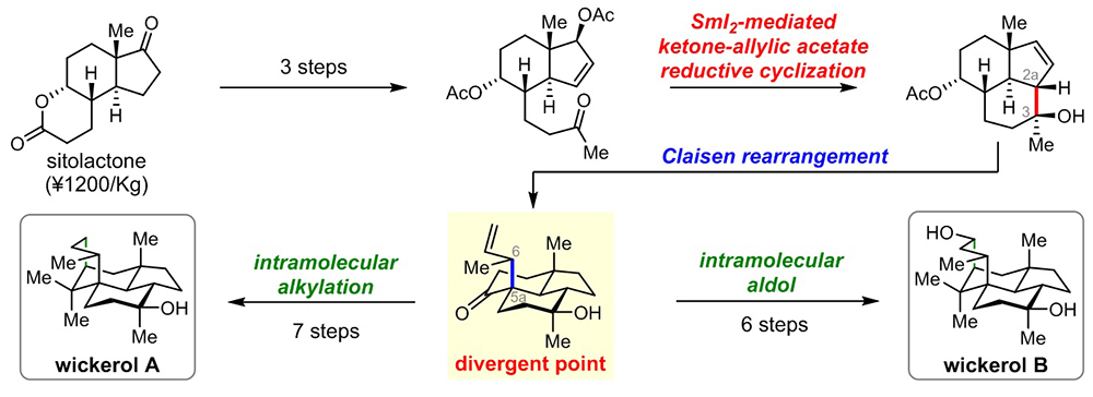 鉴于wickerols A和B结构上的差别,桂敬汉课题组以商业可得的谷内酯(sitolactone)为原料,发展了一条高效的合成路线完成了这两个天然产物的发散式合成(图1):他们首先通过二碘化钐介导的烯丙基醋酸酯-酮还原环化反应高选择性构建了三环骨架结构,随后通过Claisen重排反应立体专一性地构建C5a和C6位两个连续的手性中心,得到发散式合成的共同中间体。该关键中间体分别通过分子内烷基化和aldol反应等关键步骤即以总计16和15步反应完成了wickerols A和B的合成。博士研究生邓嘉晨为该工作所发表论文的第一作者。