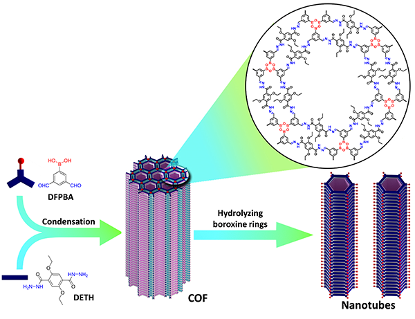 上述思路的成功实现得益于该课题组所发展的新类型COFs结构:异孔共价有机框架(Heteropore COFs)(J. Am. Chem. Soc. 2014, 136, 15885; 2016, 138, 4710; 2017, 139, 6736; 2019, 141, 14981. Nat. Commun. 2019, 10, 4609.)。这类COFs在同一聚合结构中周期性分布不同类型的纳米孔,具有精确可控的等级孔结构,不同的孔道可具有不同的物理、化学性质,是实现选择性“拆卸”的理想前体。基于这一设计,他们首先利用正交反应策略构筑了同时含有腙键和硼氧键两种动态共价键的双孔COF,它具有不同种类及性质的等级孔结构,其中一种孔道完全由腙键连接单体而形成,另外一种孔道则是由硼氧键(形成硼氧六环)连接前者而成。利用这两种动态共价键水解稳定性的差异,选择性水解硼氧键而保留腙键,成功实现了有机纳米管的制备(图1)。利用交联后的COF作为前体,还进一步实现了高稳定性纳米管的制备。