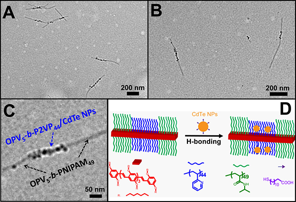 图3 (A)、(B)和(C)中间为P2VP层选择性负载CdTe纳米粒子的A-B-A三嵌段纳米纤维(M(OPV5-b-PNIPAM49)-b-M(OPV5-b-P2VP44)-b-M(OPV5-b-PNIPAM49))的TEM图。(D) 利用P2VP作为氢键受体实现三嵌段纳米纤维选择性负载的示意图。