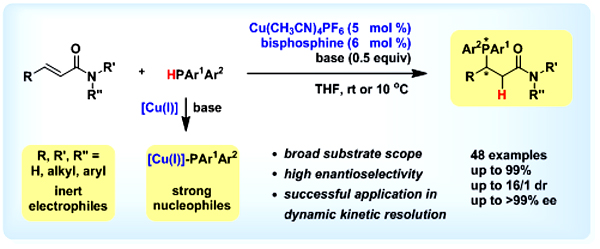 中国科学院上海有机化学研究所天然产物有机合成化学重点实验室的殷亮课题组一直致力于铜催化的不对称反应的研究。在前期的研究中,殷亮课题组发现,二芳基膦氢在铜催化剂(一价铜-双膦络合物)和有机碱的作用下会生成铜-二芳基膦物种,该物种被用于对α,β-不饱和硫代膦的共轭亲核加成反应,以高立体选择性构建了系列手性1,2-双膦衍生物(Angew. Chem. Int. Ed. 2020, 59, 7057–7062)。