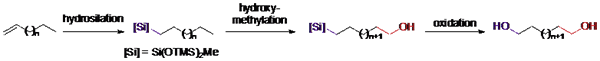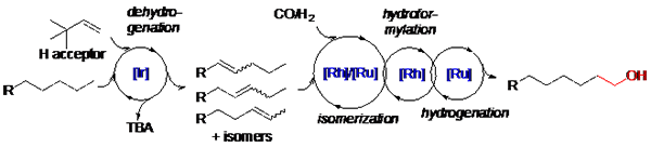 机理研究表明,金属铱催化剂作用于烷烃脱氢并与随后的反应气体CO作用失活。这避免了后续铱络合物引发的烯烃双键氢化等副反应。金属铑作用于烯烃异构——氢甲酰化过程。金属钌作用于决速步的氢化过程,同时也扮演了促进烯烃异构的角色(图一)。该三金属——四重催化体系不仅可实现直链烷烃到直链醇的转化,还可以用于以α-烯烃为起始原料,制备重要的α, ω-双醇 (图二)。