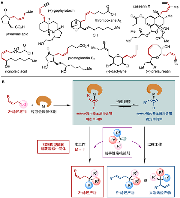 图1 (A) 含有Z-烯烃的手性天然产物和生物活性分子;(B) 过渡金属催化不对称烯丙基取代反应