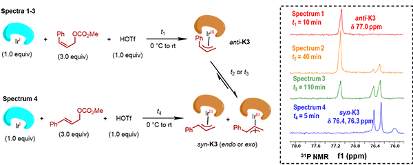 在进一步的机理研究中,他们通过核磁共振磷谱(31P NMR)和质谱实验观察到在三氟甲磺酸的促进下,一价铱物种可以与Z-烯丙基前体发生氧化加成生成anti-π-烯丙基铱络合物,并且该络合物在室温下可以逐渐异构化为热力学稳定的syn-π-烯丙基铱络合物(图3)。此外,若向含有anti-π-烯丙基铱络合物的反应体系中加入亲核试剂,该物种的磷谱和质谱信号均会立即消失,同时质谱上可以监测到产物信号。这进一步证实了π-烯丙基铱络合物接受亲核试剂进攻的速率远大于其异构化速率,即anti-π-烯丙基铱络合物异构化为syn-π-烯丙基铱络合物之前便可被亲核试剂捕获,生成含有Z-烯烃的手性产物。