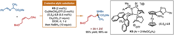 图4 铱催化α-氨基酸衍生物的Z式保留不对称烯丙基取代反应