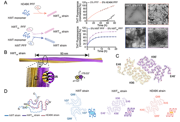 在本工作中,研究者首先通过脑立体定位注射α-syn 病理性纤维构建了PD小鼠模型,发现E46K纤维能够引发小鼠早发性运动缺陷,且在小鼠脑内引发内源α-syn形成大量病理性聚集体。相比于WT α-syn纤维,E46K纤维诱导内源性α-syn产生更多尺寸更小的聚集体且其多分布于神经突而非胞体,该聚集体传播到相连脑区如黑质也更加高效,显示出更强的流动性和细胞间传播的能力。更有意思的是,研究者发现,在体外用E46K纤维作为种子能够有效地诱导WT α-syn形成类似于E46K纤维结构的纤维(图1),且其同样能在体内引起类似E46K纤维的病理变化。