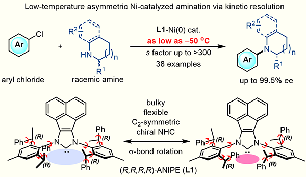 近期,中国科学院上海有机化学研究所金属有机化学国家重点实验室施世良课题组利用自主研发的ANIPE类手性氮杂环卡宾(NHC)配体实现了首例低温(最低达零下50℃)不对称Csp2-N偶联反应,发展了镍催化芳基氯和大位阻二级胺的C-N偶联动力学拆分反应 (Angew. Chem. Int. Ed. 2021, 10.1002/anie.202103803, 见图1)。此研究突破了C-N偶联这一历史悠久且重要反应在温度上的长期限制,为手性胺类化合物的合成提供了新方法,进一步丰富了金属催化的不对称偶联化学,也为手性配体设计提供了新思路,有望用于其他挑战性的不对称偶联反应。