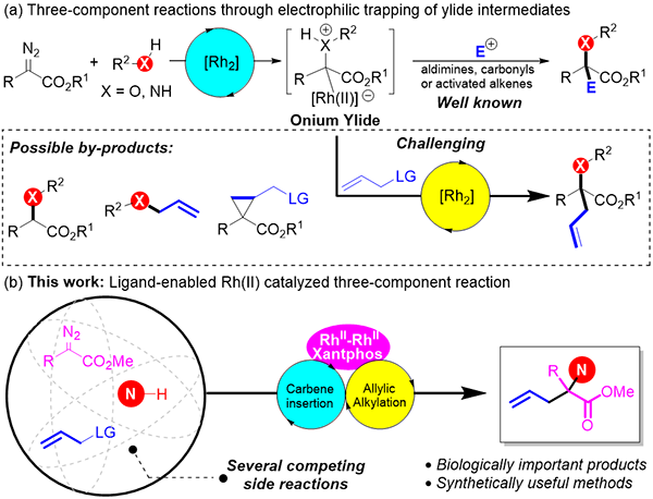 双核铑化合物催化的卡宾转移反应得到广大科研工作者的关注。近年来,国内外多个课题组,包括周其林院士、胡文浩教授、王剑波教授、Davies教授和Doyle教授等,在该领域均做出了突出的贡献。其中双核铑催化的重氮化合物参与的多组份反应可从简单的原料出发,简便快捷地构建多个化学键,具有高合成效率和高原子经济性等特点。然而通过烯丙基金属铑中间体来引入烯丙基官能团,在该类多组份反应中一直是一个挑战。通常认为双核铑(II)很难通过双电子氧化加成过程活化烯丙基化合物来获得烯丙基铑中间体。此外,诸多的副反应(如直接的两组份烯丙基取代反应、环丙烷化反应等)均可能发生,给三组份反应的实现带来了困难。研究团队发现,Rh2(Oct)4/Xantphos的组合可以有效实现卡宾转移/烯丙基烷基化的接力过程,完成胺、重氮化合物与烯丙基化合物的有序“组装”,并且有效避免了多种可能副产物的生成。该催化体系具有较为广谱的底物适用范围和良好的官能团兼容性,比如BocNH2或含有芳胺结构的药物分子以及一些天然产物衍生的重氮底物,都能够很好地转化为目标产物。此外,反应获得的一些产物是合成NK1受体拮抗剂或药物分子BMS-561392的重要中间体。