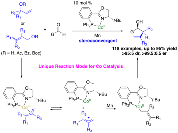 中国科学院上海有机化学研究所金属有机化学国家重点实验室孟繁柯课题组一直致力于钴催化的不对称反应研究。在前期的研究中,孟繁柯课题组发展了一系列钴催化新型不对称反应(Angew. Chem. Int. Ed. 2019, 58, 11049 –11053;Angew. Chem. Int. Ed. 2021, 60, 2694–2698;Cell Reports Physical Science2021, 2, 100406)。近期,该课题组在探索烯丙基钴的化学反应过程中,利用极性翻转策略,发现通过烯丙基自由基中间体与醛发生高立体选择性的立体汇聚式加成反应,取得了新的研究进展。(J. Am. Chem. Soc. 2021, DOI: 10.1021/jacs.1c05690)