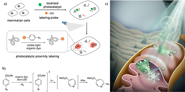 生物相容性化学反应可以在原生的生物环境进行,是研究蛋白质功能的有力工具。由于穿透细胞膜的困难性以及活细胞内复杂的生物环境,在活细胞内进行生物相容性化学反应尤为困难。分析病理过程及外部刺激下蛋白相互作用网络的变化对于疾病研究与药物研发具有重要价值,但现有的生物相容性反应无法实现亚细胞特异性的蛋白动态变化监测及标记。近日,中国科学院上海有机化学研究所陈以昀课题组与张耀阳课题组(交叉中心)合作,利用光具有高时空分辨率的特性,首次使用有机小分子染料作为亚细胞定位的生物相容性光催化剂,通过活细胞内的可见光催化叠氮标记反应实现了线粒体蛋白的特异性标记(图1a)。