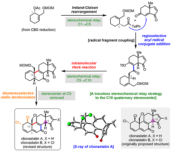 他们从已知烯酮化合物出发,通过CBS还原和Ireland-Claisen重排反应实现了手性酰基自由基前体的制备,并将产生的C1手性立体化学转移至C5位;随后通过酰基自由基共轭加成反应和分子内Heck反应构筑了天然产物核心的四环骨架结构,并将C5手性立体化学转移至C10位,得到了正确构型的C10季碳手性中心;最后通过亚磺酸内酯底物控制的烯烃双氯代反应引入了挑战性的C1和C2准平伏键双氯原子,随后脱氢反应消除C5手性中心,最终他们以16-17步反应完成了clionastatins A 和B的首次全合成。合成样品的NOE谱图和clionastatin A的单晶结构均显示天然产物的C/D环是顺式稠合的方式(即C14-H处于β构型),而不是文献报道的反式稠合的结构(即C14-H处于α构型),因此纠正了文献中错误报道的天然产物结构。值得指出的是,整个合成过程中他们使用了无痕立体化学传递(traceless stereochemical relay)的策略,即由CBS还原反应、Ireland-Claisen重排反应和分子内Heck反应实现了C10位季碳手性中心的精准构建。该工作展示了汇聚式合成策略在复杂天然产物合成中的高效性,同时体现了天然产物合成目前仍是复杂分子结构鉴定或修正的重要手段。