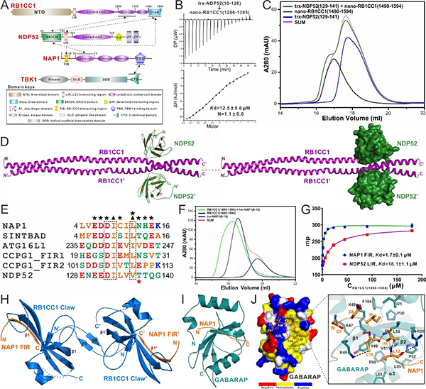 图1. NDP52和相关接头蛋白NAP1结合RB1CC1和ATG8家族蛋白的分子机制