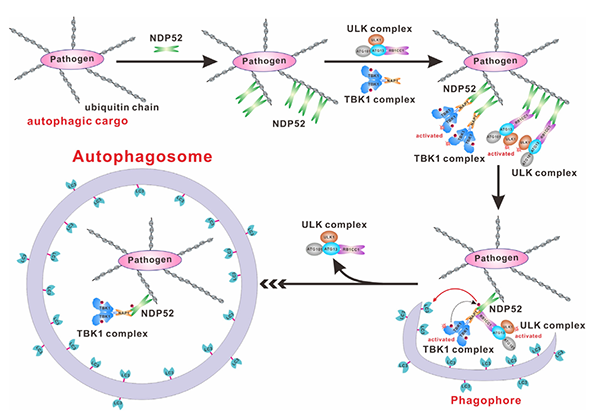 图2. NDP52在选择性自噬过程中招募ULK、TBK1复合物以及ATG8家族蛋白的工作模式图
