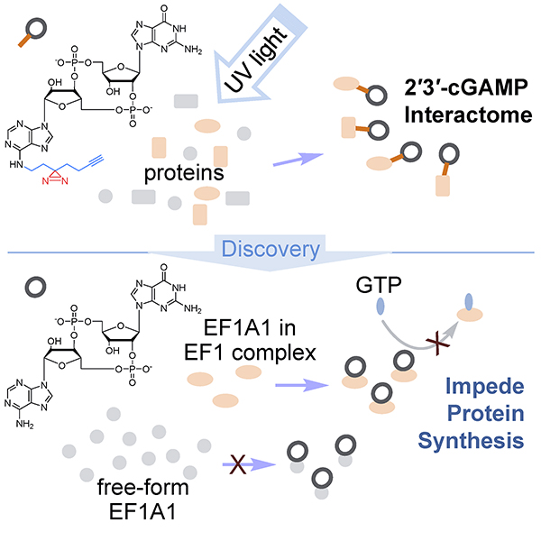 近日,中国科学院上海有机化学研究所蒋洪课题组在Cell Chemical Biology杂志上在线发表题为“A Photoaffinity Labeling Strategy Identified EF1A1 as a Binding Protein of Cyclic Dinucleotide 2′3′-cGAMP”的研究成果。该研究鉴定出EF1A1是2′3′-cGAMP的结合蛋白,发现2′3′-cGAMP通过结合EF1A1 in EF1 complex来抑制细胞翻译过程。