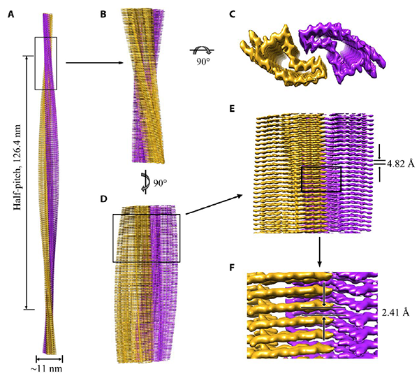 在本研究中,研究人员对克雅氏病(CJD)家族性突变位点E196K进行研究。研究人员制备了高度均一、分散的全长人源朊蛋白病理突变体E196K淀粉样纤维,并进一步运用冷冻电镜技术在近原子水平上解析了E196K纤维的高分辨率冷冻电镜结构(3.04 埃)。研究发现,E196K突变破坏了野生型朊病毒纤维中的关键相互作用力,导致了纤维结构的重排,形成了与野生型朊病毒纤维完全不同的结构。该结构由两根原纤维以左手螺旋的方式缠绕而成,纤维核心宽度约为11 nm,半螺旋周期为126.4 nm(图1)。