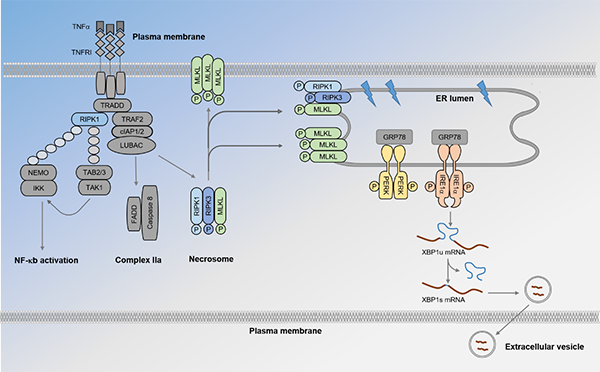 此外,作者发现necroptosis激活UPR的机制与经典的UPR激活机制不同。在细胞静息状态下,分子伴侣GRP78与PERK、IRE1、ATF6的ER管腔内结构域(luminal domain)结合而抑制其激活。在经典UPR激活条件下,未折叠蛋白与GRP78结合,导致PERK、IRE1与GRP78解离而寡聚化激活。而necroptosis发生时,MLKL促使ER发生形态变化,GRP78与PERK,IRE1不发生解离,直接通过PERK的跨膜结构域(transmembrane domain)介导其激活。该发现揭示了necroptosis激活UPR信号通路的独特机制,加深了对于necroptosis和UPR信号通路介导的细胞间通讯及相关疾病的理解(图一)。