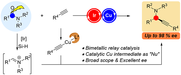 中国科学院上海有机化学研究所金属有机化学国家重点实验室王晓明课题组致力于研究多金属物种参与的反应体系,包括通过金属间电子传递、基团转移实现挑战性的转化过程和探究内在规律、仿酶的双多核金属催化剂的开发和金属团簇催化等。近日,受到前人关于金属铱催化酰胺,在硅烷存在条件下,可以将酰胺转化为亚胺或亚胺正离子活性中间体的启发,王晓明团队与厦门大学黄培强教授合作,采用铱-铜双金属接力催化的方式,实现了惰性酰胺的脱氧不对称炔基化反应 (Angew. Chem. Int. Ed. 10.1002/anie.202111029)。该方法反应条件温和,官能团兼容性好,以中等至良好的收率、优异的对映选择性合成了一系列在有机合成中具有重要价值的合成砌块—手性炔丙胺类化合物。
