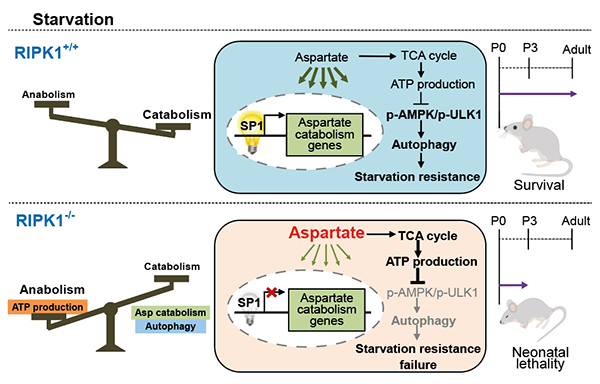饥饿应激在哺乳动物新生儿存活、肿瘤微环境及缺血再灌注等一系列生理和病理过程中发挥着重要的作用。代谢调控对于饥饿条件下细胞及机体维持能量稳态及存活非常关键。蛋白激酶RIPK1是细胞存活与死亡的重要调控因子。早在1998年就发现了RIPK1缺失的小鼠会在出生后1-3天内死亡,但分子机制一直不明确。新生小鼠刚出生后,由于脱离了母体营养的供应,处于严重的饥饿状态。在正常情况下,新生儿会启动细胞自噬等代谢反应以抵御饥饿直到获取新的营养供给。RIPK1缺失小鼠的出生致死表型提示RIPK1对饥饿应激调控至关重要。