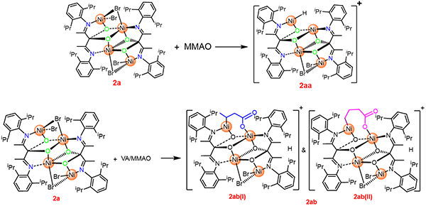 研究人员与郭寅龙团队、大连理工大学罗一教授合作,利用溶剂辅助电喷雾质谱技术(SAESI-MS)捕获反应物种。他们发现催化剂的四核结构稳定,经过助催化剂MMAO活化后,依然可以检测到保持四核结构的活性物种;在极性单体1-丁烯酸的存在下,捕获到1-丁烯酸(VA)插入并与多核金属形成稳定螯合物的结构信号。利用DFT计算表明多核催化剂中相邻的多个镍中心分别与1-丁烯酸中的羧基及碳碳双键作用,通过Ni-Ni协同作用促进极性单体的配位与插入,从而实现了共聚合。聚合体系中少量的质子起到了促进官能团与金属中心的解离、避免催化剂“毒化”失活的作用。
