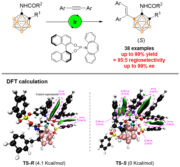 中科院上海有机所沪港化学合成联合实验室谢作伟课题组长期致力于过渡金属催化的碳硼烷B-H键可控官能团化研究(Acc. Chem. Res. 2021, 54, 4065)。该研究团队在前期发展的钯催化分子内B-H不对称芳基化基础上 (J. Am. Chem. Soc. 2018, 140, 4508),利用铱催化邻-碳硼烷的分子间B-H键不对称烯基化反应,实现了一系列chiral-at-cage笼手性碳硼烷的高效构建(Nat. Commun. 2021, 12, 7146)。