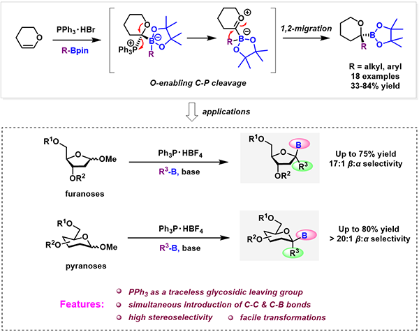 中科院天然产物有机合成化学重点实验室何智涛课题组致力于不饱和烃的转化及应用领域。近期,何智涛课题组在J. Am. Chem. Soc.上在线发表了题为“Stereoselective gem-C,B-Glycosylation via 1,2-Boronate Migration”的研究论文(J. Am. Chem. Soc. 2022, doi.org/10.1021/jacs.1c11842)。该研究工作实现了无金属参与的三苯基膦介导的烯烃的1,1-碳硼化反应,并将其应用于立体选择性的双糖苷化修饰上,展现出潜在的应用价值。