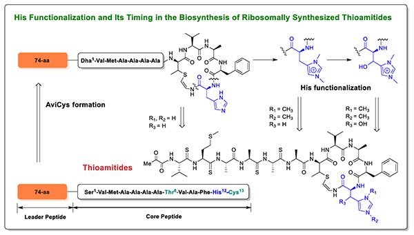 课题组结合体内基因敲除、大肠杆菌异源表达、体外生化测活和计算分析,详细阐释了 β-羟基-N,N-二甲基组氨酸的形成机制和生物合成逻辑。以组氨酸残基为底物,该单元的形成依赖C 末端烯基硫醚大环体系的建立,严格按照N,N-双甲化和β-羟基化的催化顺序进行。研究还对组氨酸官能团化的特异性和与其它翻译后修饰反应的兼容性进行了系统考察。