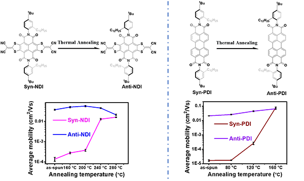 “阻转异构”(atropisomerism)是由于空间位阻效应使得化合物中化学键的自由旋转受阻而引起的立体化学现象,所形成的可拆分的构象异构体称为“阻转异构体”(atropisomers),例如常见的邻取代联苯。阻转异构已广泛应用于药物化学、超分子化学和有机化学等领域。高希珂课题组设计合成并分离得到了系列室温构象稳定的共轭二酰亚胺类阻转异构体(Syn-NDI, Anti-NDI, Syn-PDI和Anti-PDI,图1),并将其作为有机半导体应用于热刺激-响应型有机场效应晶体管(OFET)器件。研究发现,在热溶液中,这些阻转异构体间均可快速相互转化,而在固态加热条件下,只有Syn-阻转异构体能单向转化为Anti-阻转异构体,反之则不能。Anti-阻转异构体的OFET器件性能受其薄膜热退火温度的影响较小,而Syn-阻转异构体的OFET器件性能受其薄膜热退火温度的影响巨大,这源于热作用下Syn-阻转异构体向Anti-阻转异构体的单向转化。伴随着Syn-NDI转化为Anti-NDI,其OFET器件的电子迁移率提升了近100倍,而Syn-PDI转化为Anti-PDI时,其OFET器件的电子迁移率提升了约5000倍。需要指出的是,热作用下Syn-NDI和Syn-PDI在薄膜中分子构象转化的热退火温度明显不同(图1),这为新型温度传感器的研发提供了研究思路。