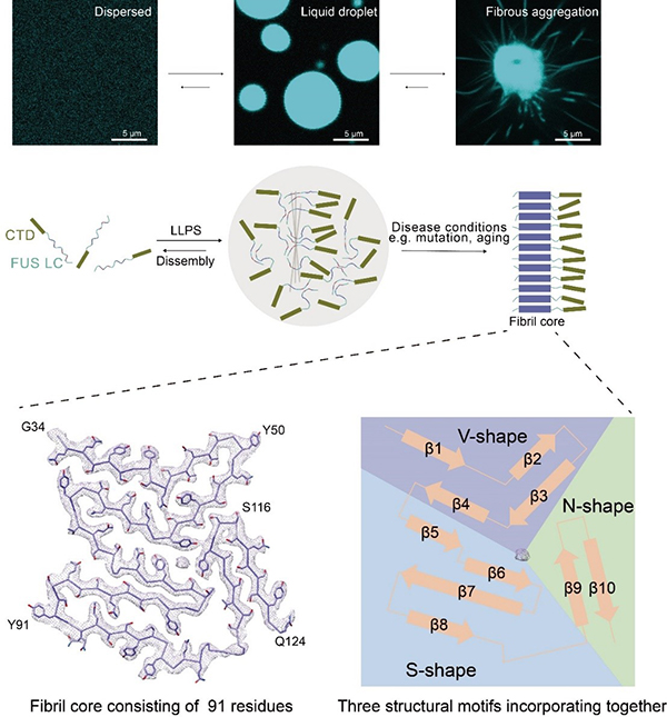 2022年1月,中国科学院上海有机化学研究所生物与化学交叉中心刘聪课题组在iScience上在线发表一项最新研究成果,题目为 “Molecular structure of an amyloid fibril formed by FUS low-complexity domain”。该工作中发现渐冻人症关键致病蛋白FUS通过液-固相转化形成高度稳定且具有细胞毒性的淀粉样纤维聚集体,进一步,通过低温冷冻电镜解析病理性纤维聚集体的原子结构,并阐释其液-固相转化的分子机制,为渐冻人症的发病机理提供新的理解。