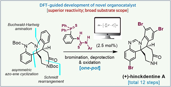 中国科学院上海有机化学研究所洪然课题组在开发亚硝基–烯新反应模式和全合成应用的基础上(Angew. Chem. Int. Ed. 2015; Tetrahedron Lett. 2015; Angew. Chem. Int. Ed. 2017; Tetrahedron 2019; Chem. Rec. 2022),通过设计新的合成策略和卤代催化剂,完成了海洋生物碱hinckdentine A的不对称合成 (JACS Au 2022, DOI: 10.1021/jacsau.2c00048)。他们首次将不对称偶氮—烯反应用于天然产物的全合成中,以构建目标分子的氮杂季碳手性中心。受路易斯碱催化与卤代酶氢键活化的启发,研究团队开发了催化溴代反应的高效有机催化剂,在合成后期实现了生源启发的三溴代反应,高效完成了hinckdentine A的全合成(图)。与四川大学苏志珊教授合作,通过对溴代反应的理论计算,对于合成中关键中间体的选择、膦硫—硫脲催化剂的作用模式有了深刻理解。催化剂通过多种非共价相互作用与底物相结合,协同活化了溴代试剂,大大降低了溴代反应的能垒。同时,该有机小分子催化剂也成功应用于一系列(杂)芳环、小分子药物与天然产物的溴代和氯代反应中,对部分底物表现出特殊的区域选择性,为药物先导化合物的后期结构修饰提供新方法。
